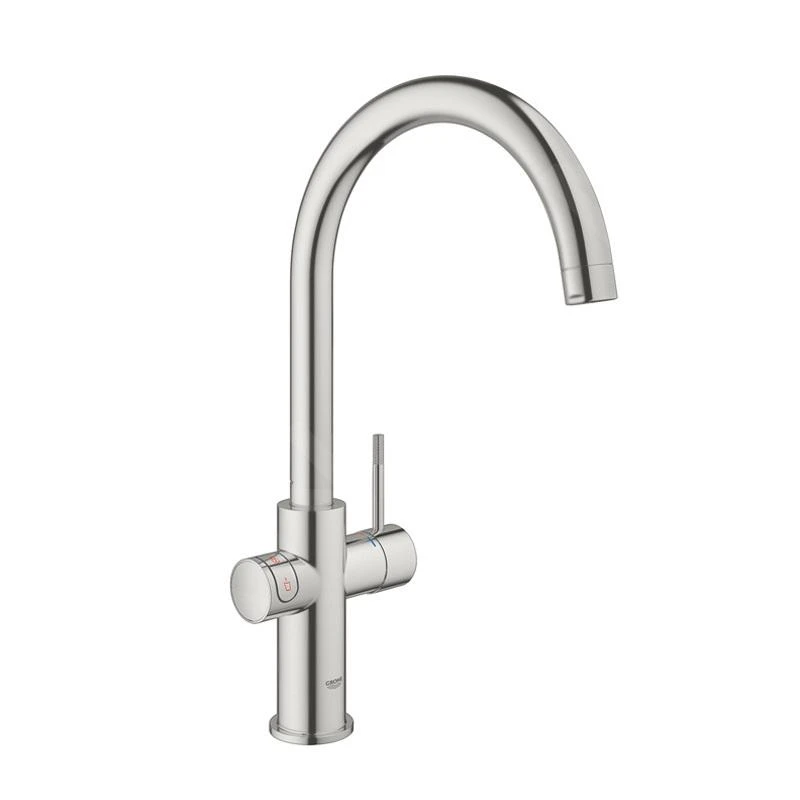 GROHE RED Duo keukenkraan (C-vormige uitloop) met filterset en boiler in maat L voor ogenblikkelijk kokend water. Mat roestvrijstalen oppervlak